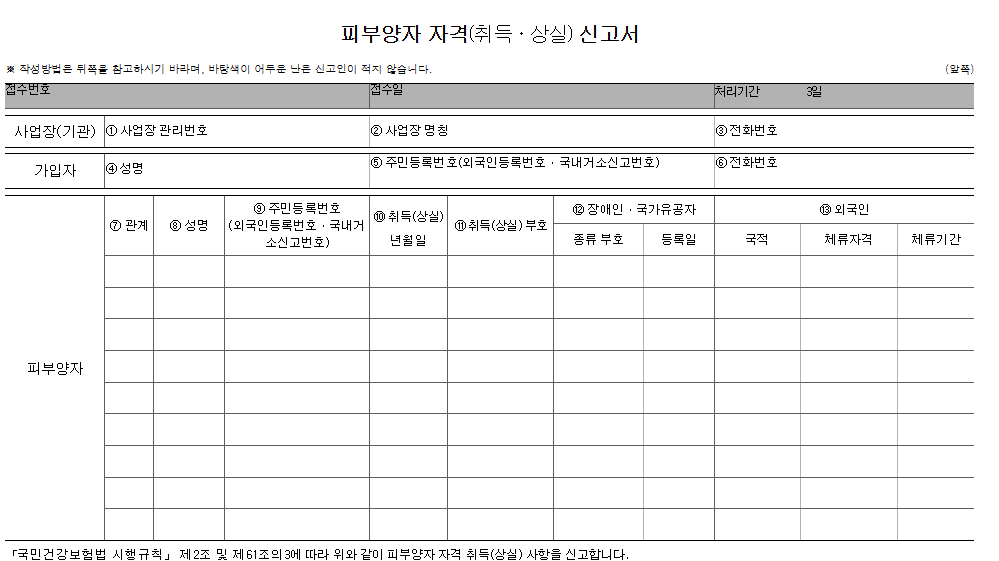 - 피부양자 자격(취득·상실)신고서 (국민건강보험법 시행규칙 별지서식 제1호)