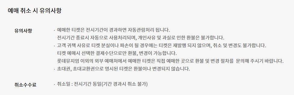 - 개인 사유로 인한 환불이 불가능하므로, 관람 날짜와 시간을 신중하게 결정하셔야 합니다.